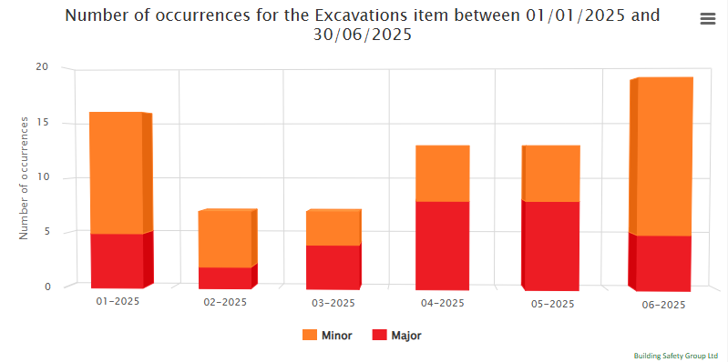 The Building Safety Group (BSG) has reported a 50% increase in excavation breaches on construction sites. The report was based on 7,000 site inspections carried out during the first half of 2025, which compared Q1 with Q2.